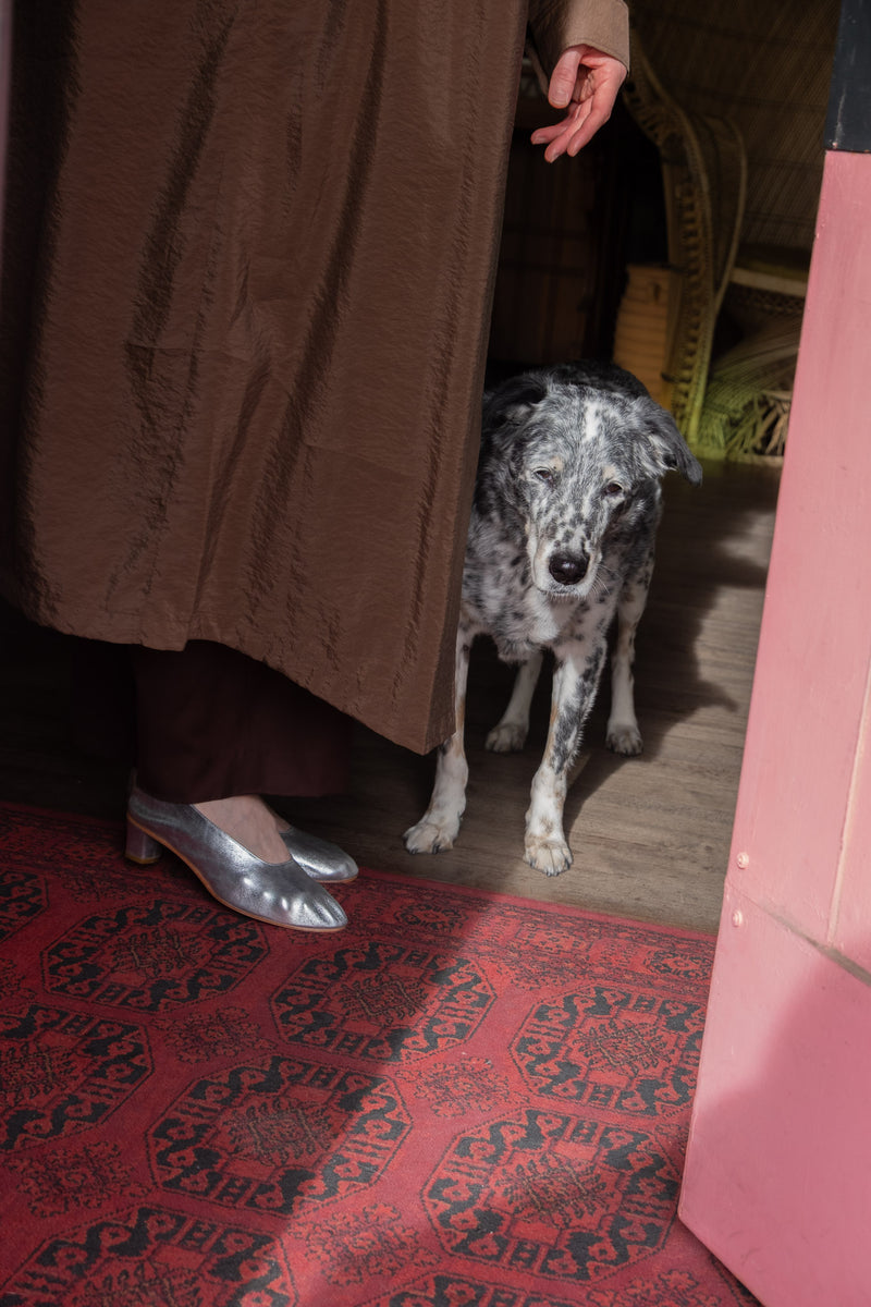 Wearing the Nomia Wide Leg Pleated Trouser in Carob, Renata Brenha Formiga Polo Dress in Cherry & Pink, and the Martiniano High Glove in Silver