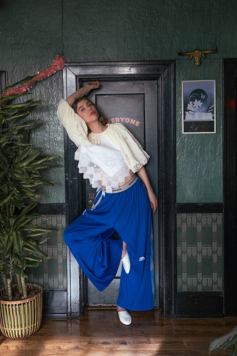 My tried and true thrifted adidas track pants, I love them so! I always want to be comfy and especially with work, I hate anything constricting! If I can dance and work in it I'm happy. adidas track pants, an old sweatshirt, an orthopedic shoe of sorts, and a Fort Greene dad hat most days, maybe a vintage silky mens button up + vintage jewelry stacks if I’m feelin fancy!